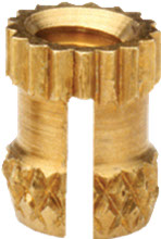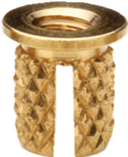 Most commonly used in thermoset plastic. The pilot end acts as a guide during insertion process and the helical knurls on the side help secure the insert in place.